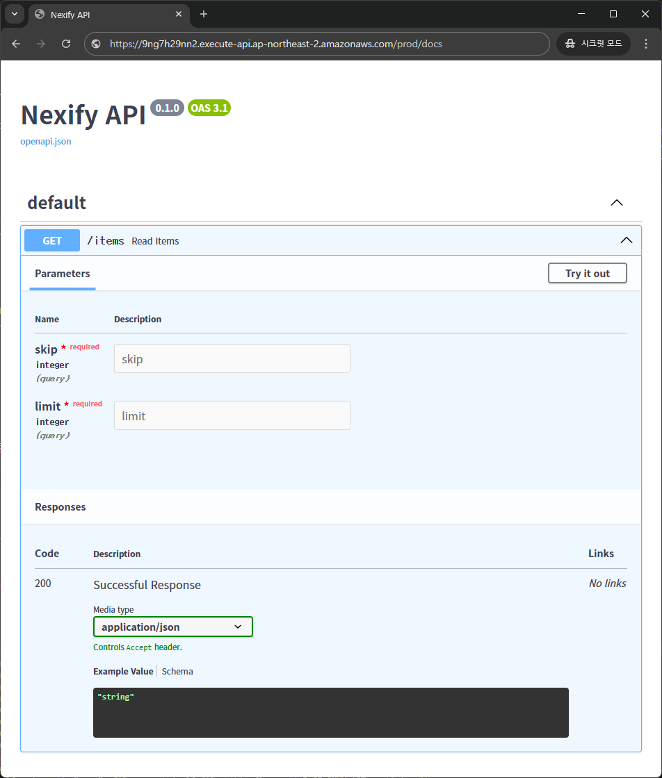 Since Nexify automatically generates API documentation based on Python type hints, you can see that the path parameter is correctly documented as an int type. Their default values are also clearly displayed as 0 and 10.